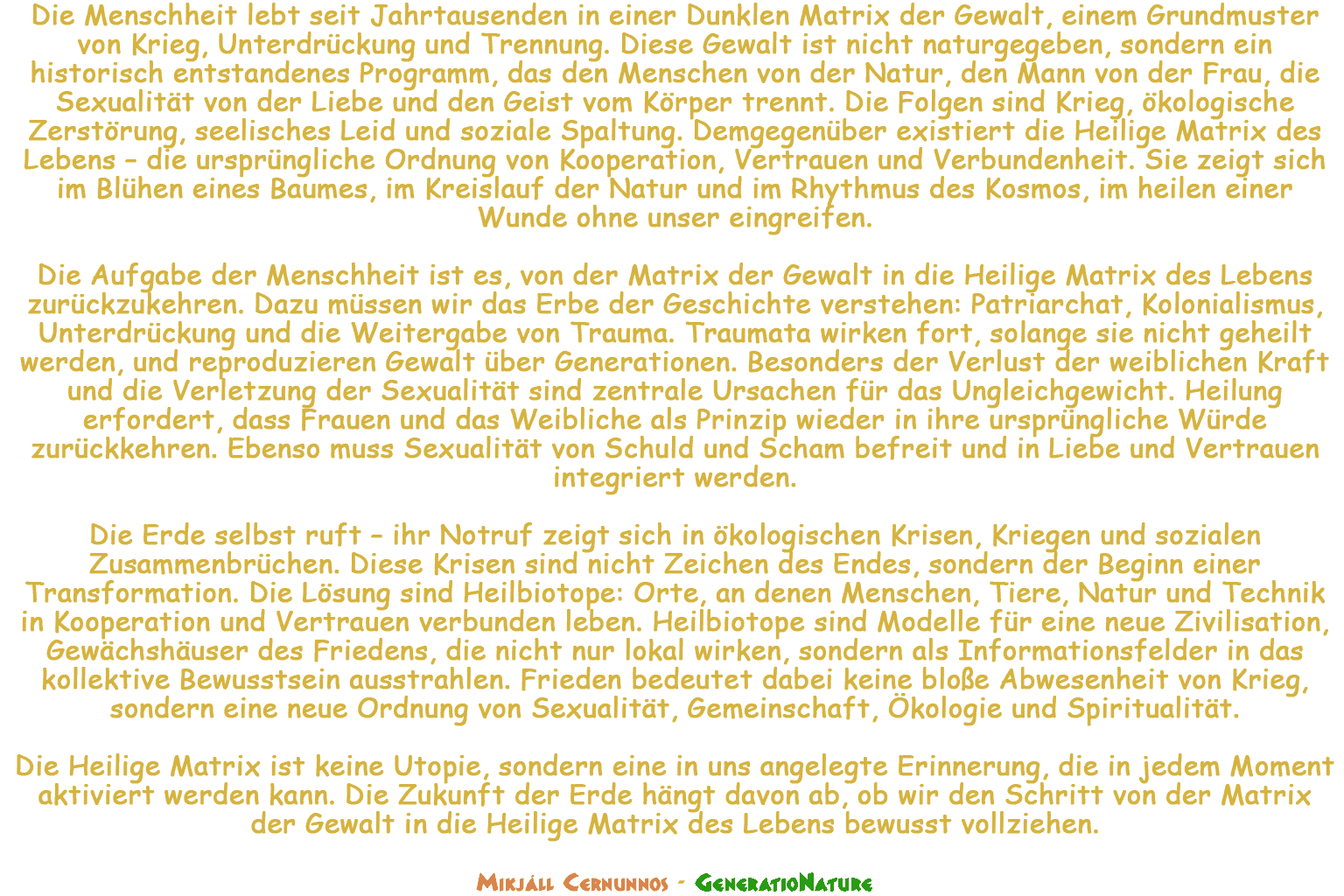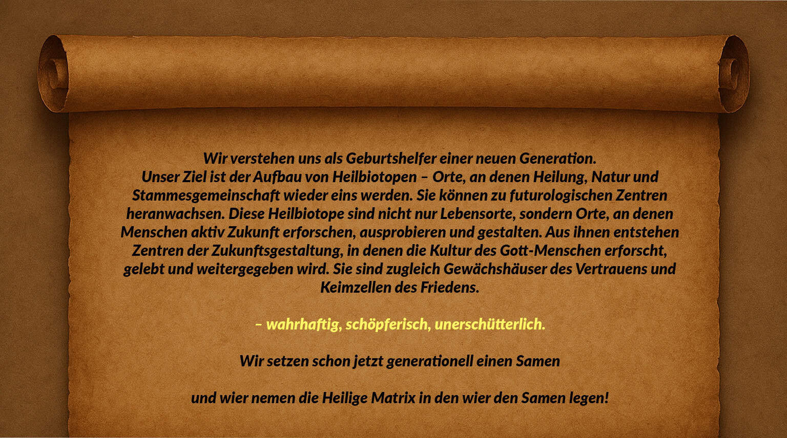 Wir glauben an die Möglichkeit einer Zukunft ohne Krieg und an eine Liebe, die frei ist von Eifersucht. Mit GeneratioNature gründen wir eine Gemeinschaft, die schon jetzt generationell den Weg weist. Unsere Vision ist es, Heilbiotope aufzubauen – Orte, an denen geforscht, gelebt und erprobt wird, wie eine neue planetarische Kultur entstehen kann. Eine Kultur, die zum Ursprunge der Heiligen Matrix zurück findet, durch WARHAT! Eine Kultur des Friedens die auf qualitativ hohen starken ethischen Fundament baut. DAs Fundament der Heiligen Matrix