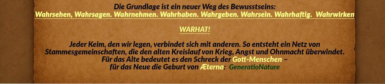 GenerationNature – Æterna ist die Vision einer neuen planetarischen Kultur. Sie gründet auf einem Netzwerk autonomer Heilbiotope -StammesGemeinschaften. Es ist die Vision einer nach-patriarchalen Zivilisation. Frei von Krieg, Gewalt, Ohnmacht, Angst und Gier.